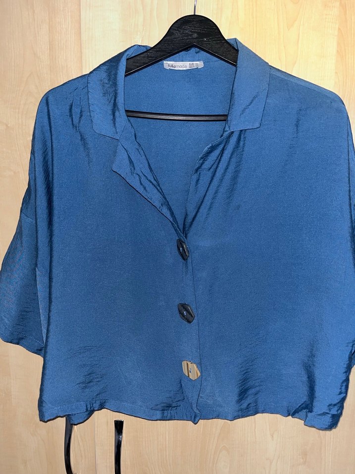 Düğmeli, yakalı, kısa kollu ve bol kesim bu mavi gömlek, Günlük rahat sokak stili için uygun. küçük bir defosu vardır fotoğrafta gösterilmiştir.