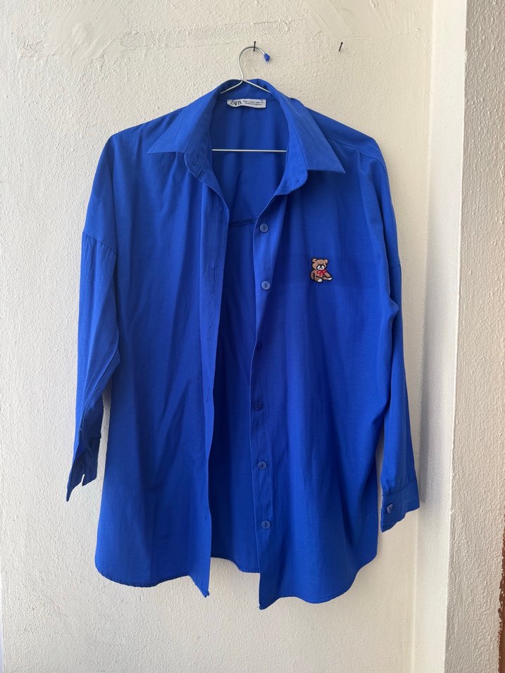 Düğmeli, uzun kollu, mavi renkli, rahat kesim gömlek. Yumuşak ve sıcak kumaştan, ofis için uygun. ✨