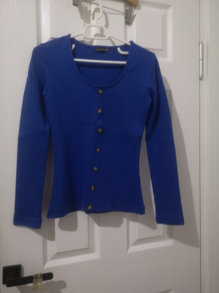 Fitted kesim, uzun kollu, düğmeli mavi ince triko kazak. Normal midi boyda, günlük rahat sokak stili için uygundur.
