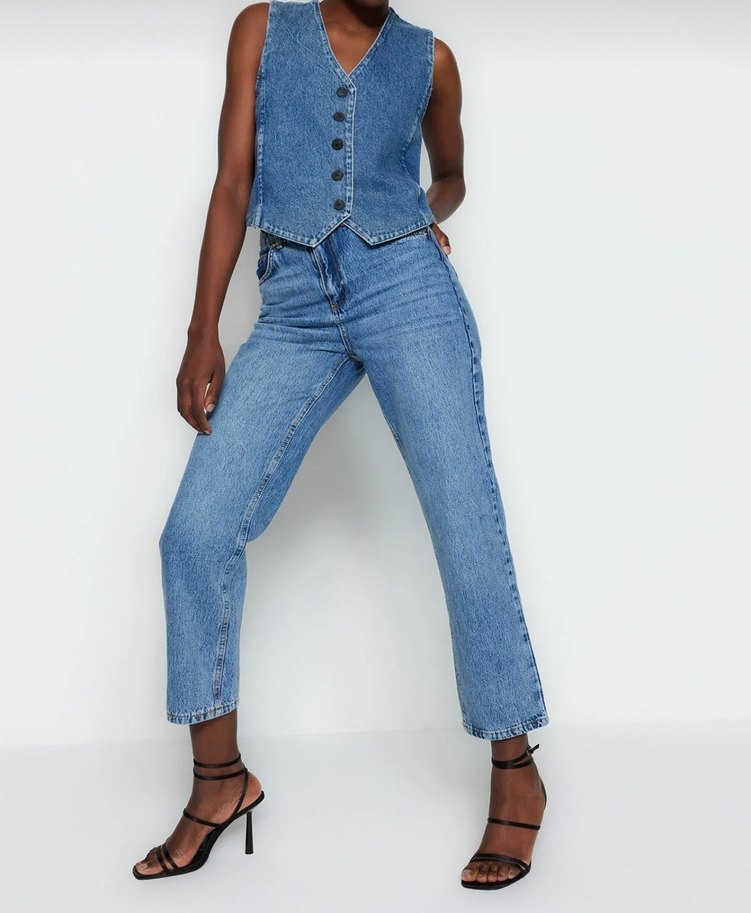 Düğmeli detaylara sahip, normal boy ve regular fit mavi denim kadın jean pantolon. Günlük ve sokak stiline uygun.
