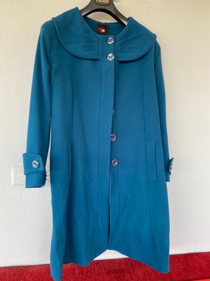 Geniş yakalı, düğmeli mavi kadın kaban. Uzun kollu, düğmeli manşetleri ve iki yan cebı bulunur. Serin havalar için uygun. 50 beden