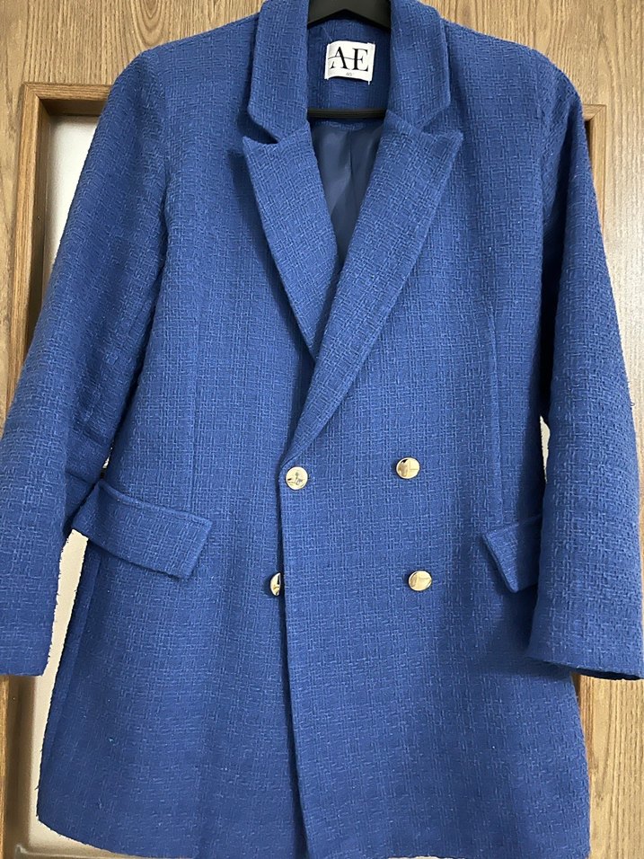 Düğmeli, parlak mavi keten kumaştan yapılmış kadın blazer ceket. Notlu yaka ve uzun kolludur, normal midi boyda ve ofis kullanımı için uygundur.