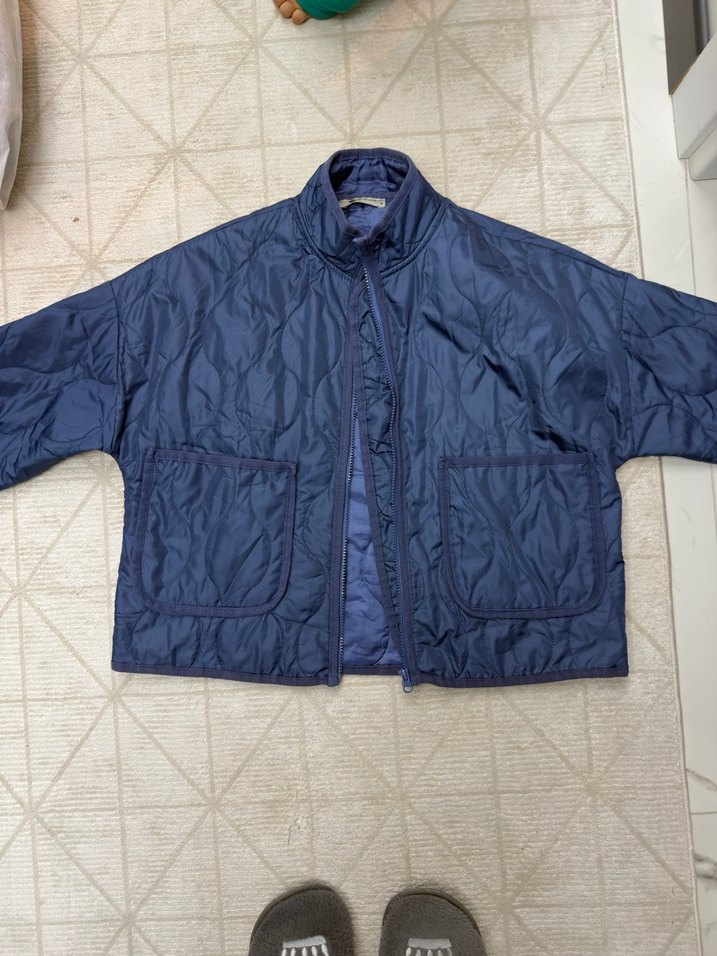 Yüksek yakalı, düğmeli koyu mavi keten kadın ceket. Bol kesim, uzun kollu ve midi boyda, yumuşak keten kumaştan yapılmıştır. Günlük kullanıma uygun, rahat ve sade stil.