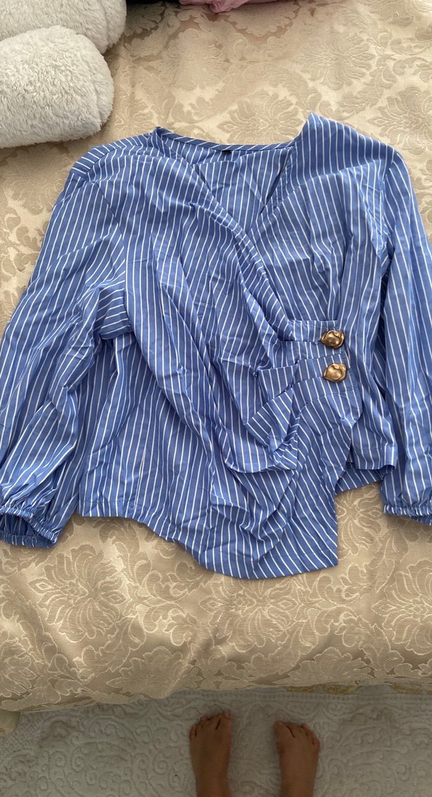 Mavi keten kadın gömlek, uzun kollu, düğmeli, yakalı ve bol kesimdir. Midi boyda, hafif zebra desenli, günlük sokak tarzı için uygundur.