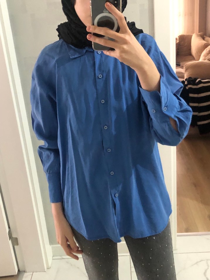Düğmeli, uzun kollu, keten kumaştan mavi gömlek. Yaka ve rahat kesimiyle günlük sokak stiline uygundur. ✨