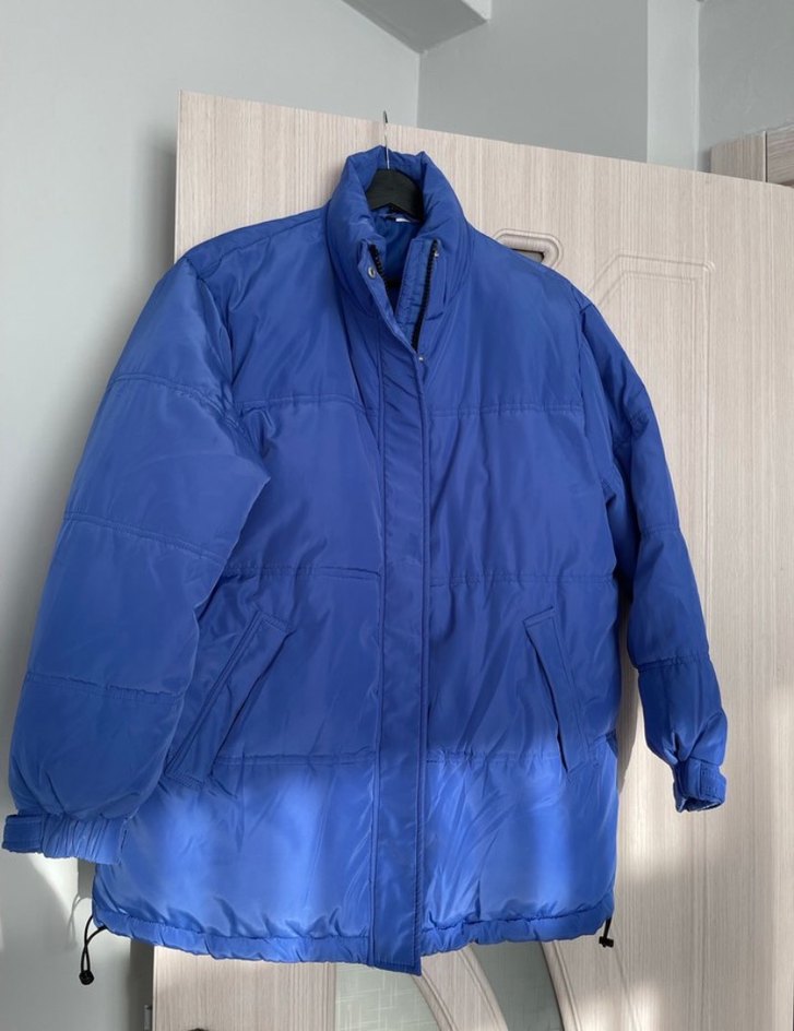 Düğmeli, yüksek yakalı mavi kadın kışlık mont, bol kesim ve uzun kolludur. Parlak kumaşı sokak stiline ve günlük kullanıma uygundur. ❄️