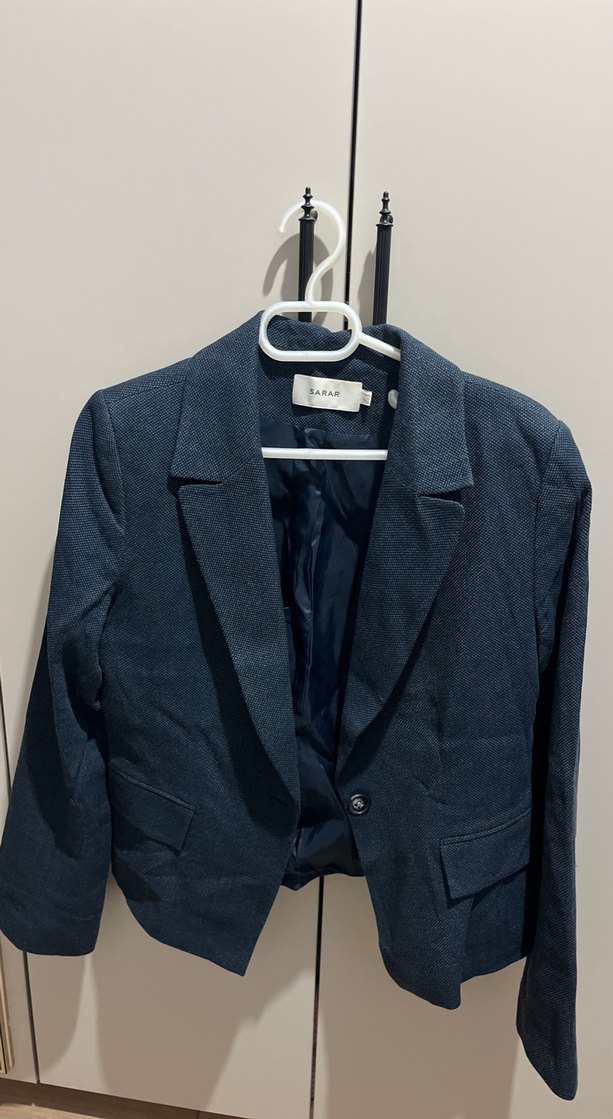 Bu mavi kot blazer ceket, kesimli yaka, düğmeli kapama ve uzun kollara sahiptir. Ofis için trend rahat bir görünüm sunar.