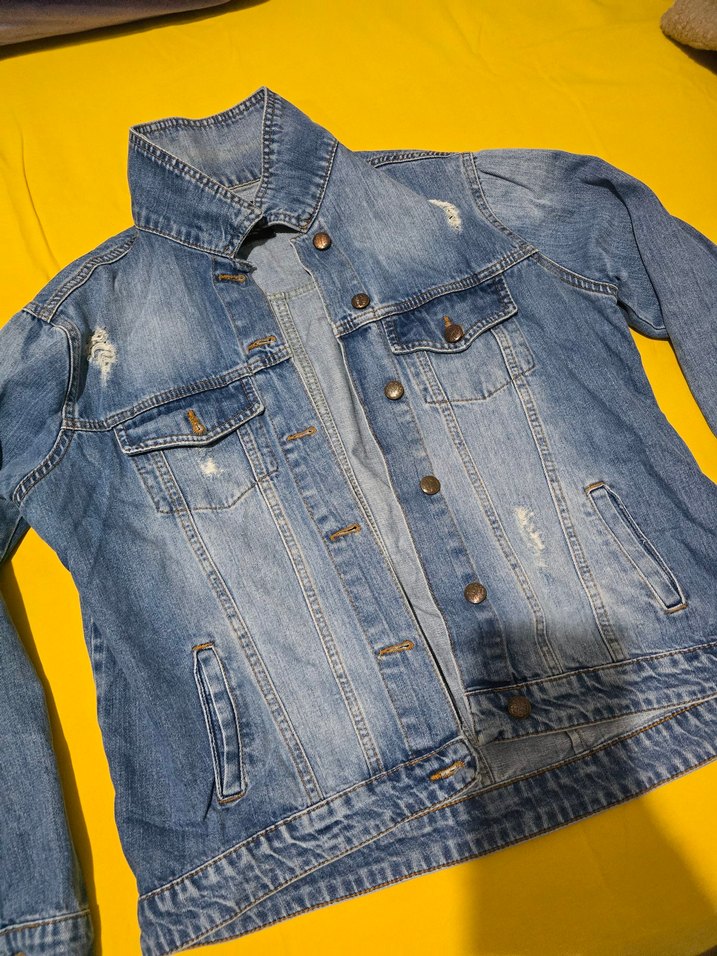 Düğmeli, uzun kollu, notched yaka mavi kot ceket. Rahat kesim, günlük kullanım için uygun