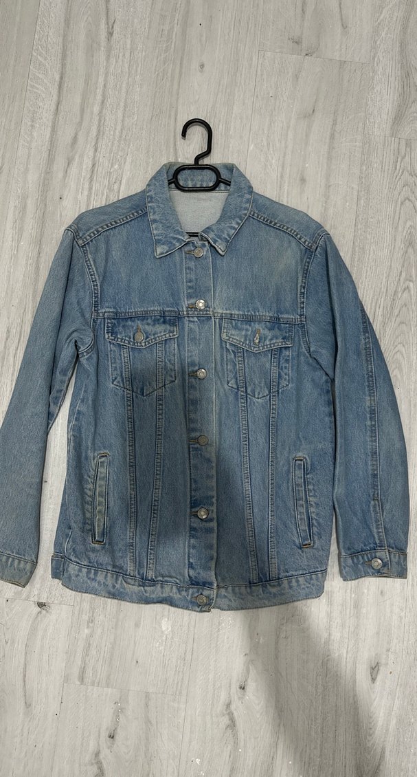 Düğmeli, normal boy, bol kesim mavi kot ceket. Uzun kollu ve yakası kesik, günlük kullanıma uygun sokak stili.