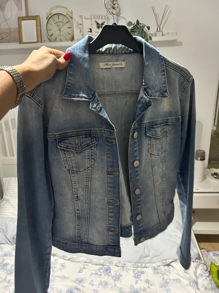 Düğmeli, normal boy, ince kesim kadın kot ceket. Mavi renkte, çentikli yaka ve askılı kol tasarımıyla günlük sokak stiline uygun.