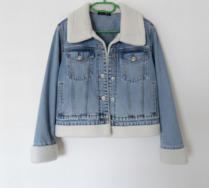 Düğmeli, uzun kollu, mavi kot ceket. Geniş kesim ve yaka ile manşetlerde yumuşak astar bulunur. Rahat sokak stili için uygundur.