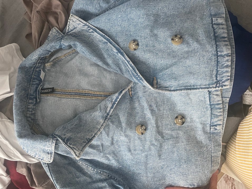 Düğmeli ön kısmı ve kesik yaka detayı olan, normal boyda ve askılı kollu, mavi renkli fitted kot ceket. Günlük sokak stili için uygundur. 3-4 kere giydim