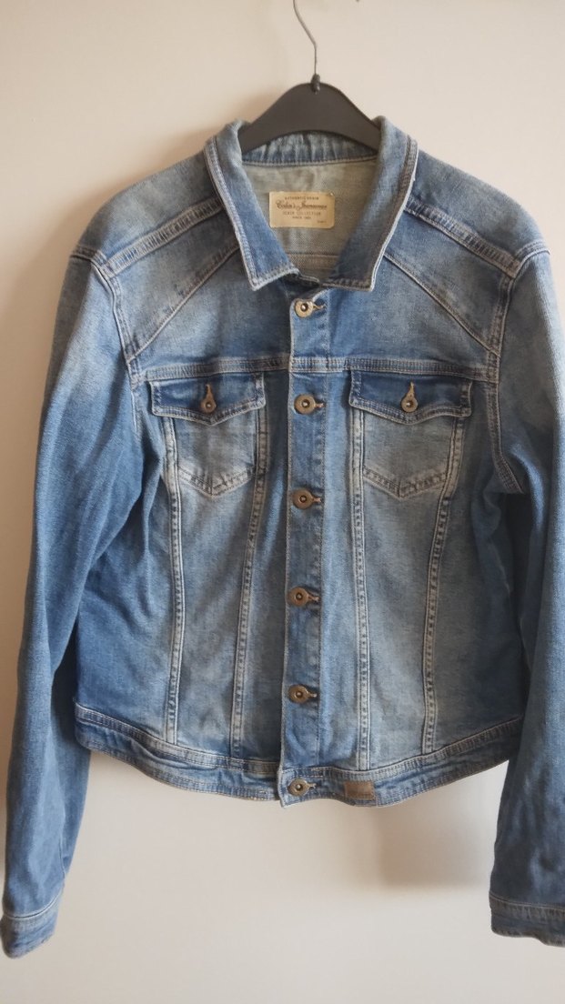 Düğmeli, notched lapel yakalı mavi kot ceket. Uzun kollu, normal kesim ve günlük kullanıma uygun sade tasarım. Yeni temiz.