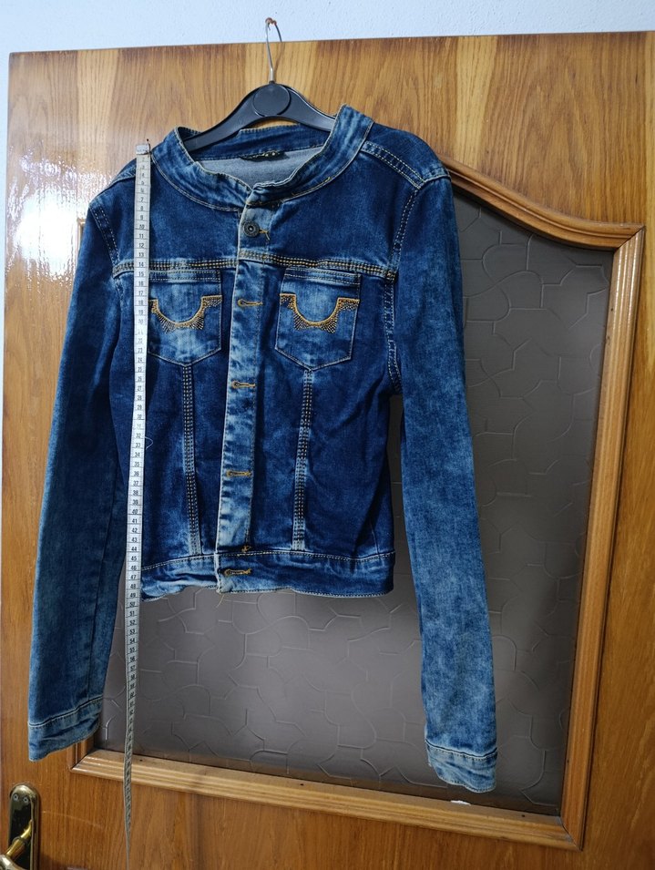 Düğmeli, mavi kot ceket, yakası kesik ve uzun kolludur. Normal midi boyda, parlak dokusu günlük sokak stiline uygundur.