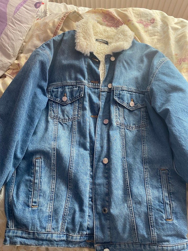 Düğmeli ön, uzun kollu ve tüy detaylı yakaya sahip mavi kot ceket. Salaş kesimi ve parlak görünümüyle rahat sokak stiline uygundur.