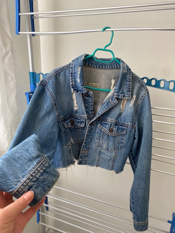 Düğmeli, uzun kollu, mavi kot ceket. Notlu yaka ve yırtık detaylı, kısa kesim tasarımıyla gündelik sokak stili için uygun.