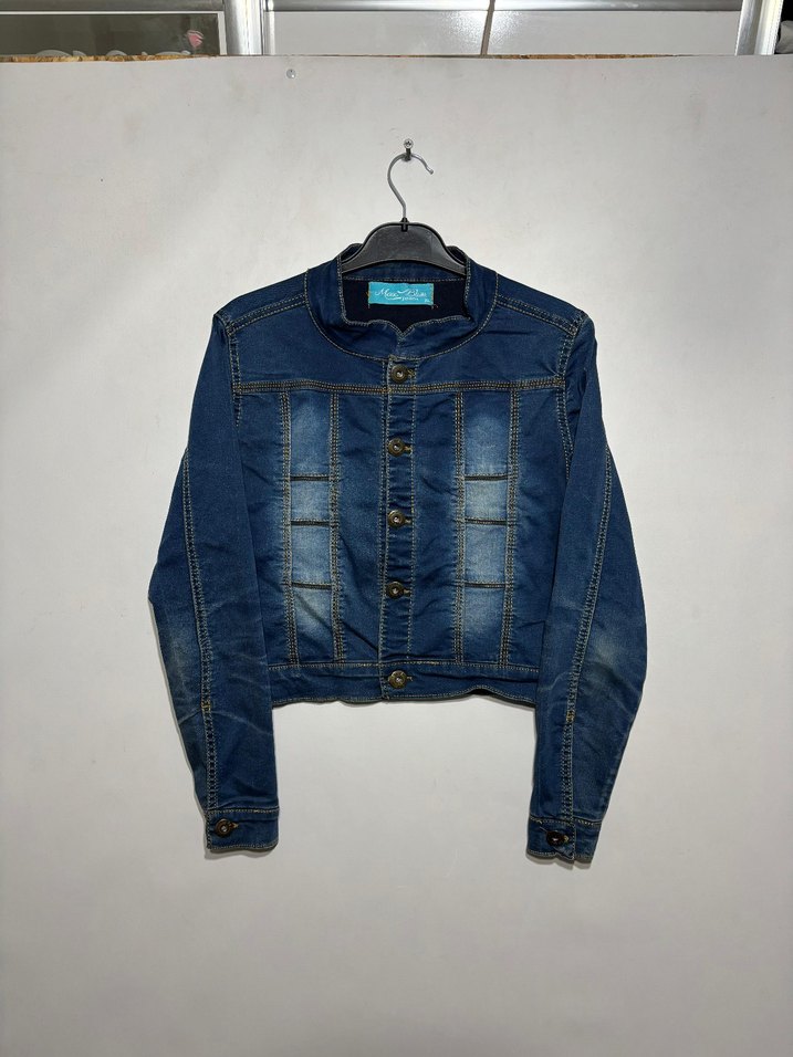 Uzun kollu, düğmeli ve kesimli mavi kot ceket. Parlak dokusu ve normal boyu ile günlük sokak stiline uygundur.