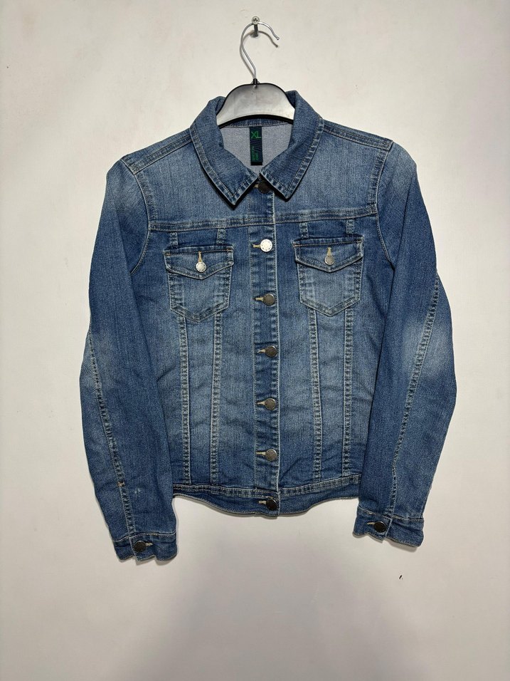 Düğmeli ön ve kesik yaka detaylı mavi kot ceket. Uzun kollu, normal kesim, günlük rahat sokak stili için uygun. Parlak görünümlü, desensiz tasarım.