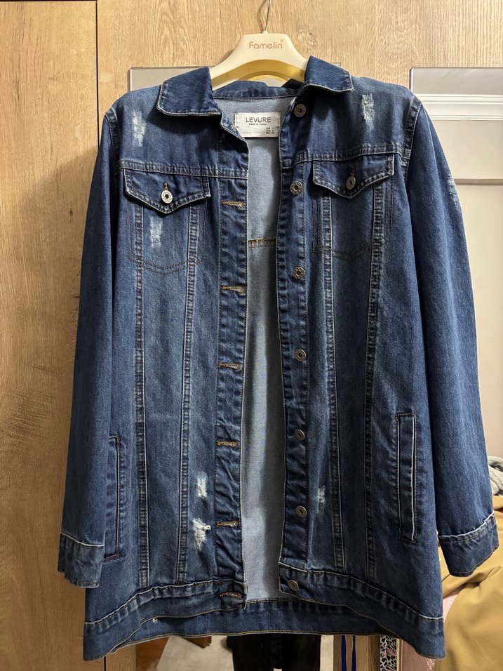 Düğmeli, parlak mavi renkte, uzun kollu ve notched lapel yakalı, bol kesim kadın kot ceket. Herhangi bir defosu yok iyi durumda.