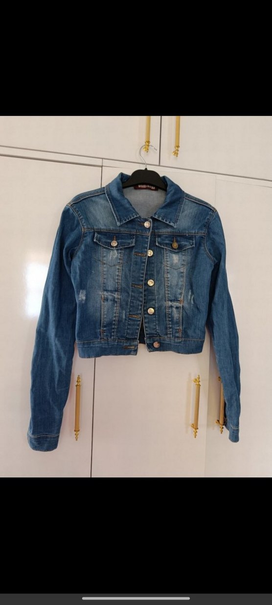 Düğmeli, parlak mavi kot kumaşından, uzun kollu ve kesimli, günlük kullanıma uygun kadın kot ceketi.