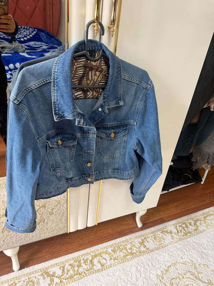 Düğmeli, bol kesim, mavi kot ceket. Uzun kollu, normal boyda ve kesik yaka detaylıdır. Günlük rahat kullanıma uygundur.