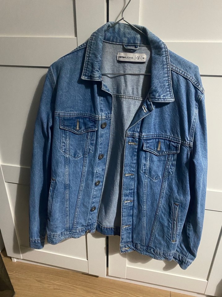 Düğmeli, notalı yakalı mavi kadın kot ceket, bol kesim ve uzun kollu. Günlük rahat sokak stili için uygundur.
