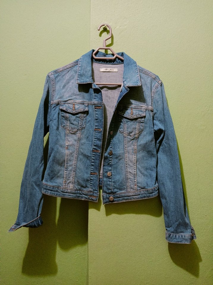 Düğmeli, uzun kollu, normal boyda, kesimli mavi kadın kot ceket. Notlu yaka ve düğmeli kapanışa sahiptir. Günlük sokak tarzına uygundur.