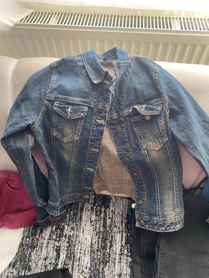 Bu düğmeli mavi kot ceket, uzun kollu ve kesimli yakaya sahiptir. Günlük kullanım için uygun, rahat sokak modası tarzındadır.