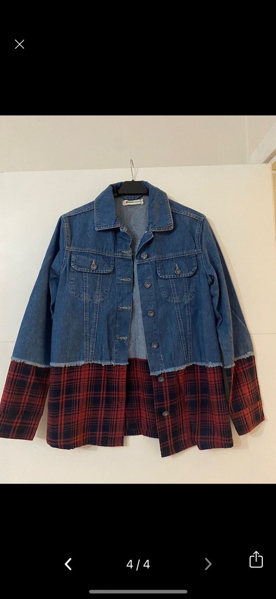 Düğmeli, uzun kollu ve normal kalıp mavi kot ceket. Alt kısmı ekose kumaş detaylı, günlük kullanıma uygun rahat tasarım.