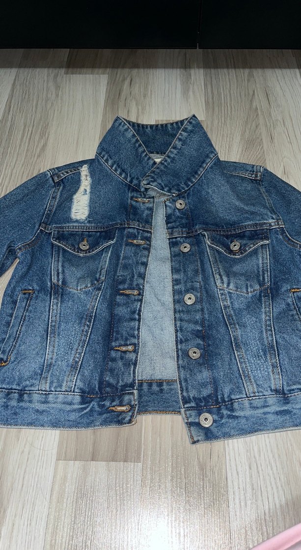Düğmeli önü ve kesik yakası olan, normal boyda, dar kesim mavi kadın denim ceket. Uzun kollu ve parlak renktedir, günlük kullanıma uygundur.