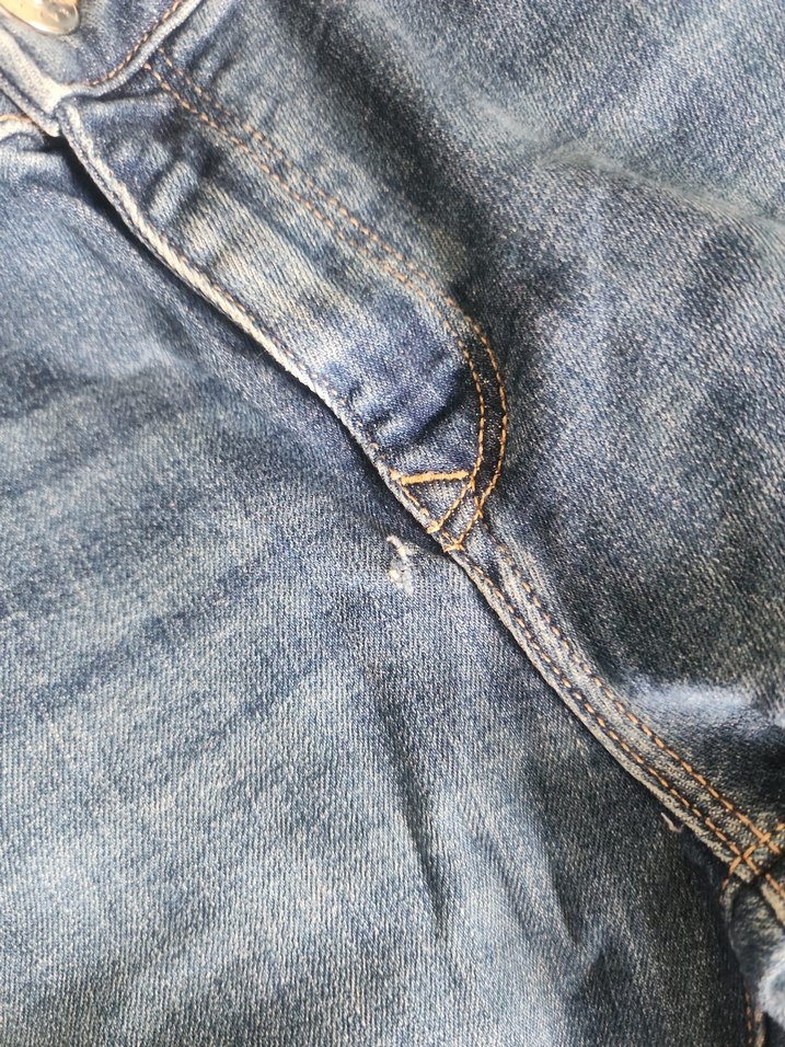 Düğmeli, normal boyda, mavi kot kumaştan yapılmış, kadınlar için uygun, sade ve rahat bir tarz sunan dar kesim kot pantolon. on kısmında ufak bir defosu var