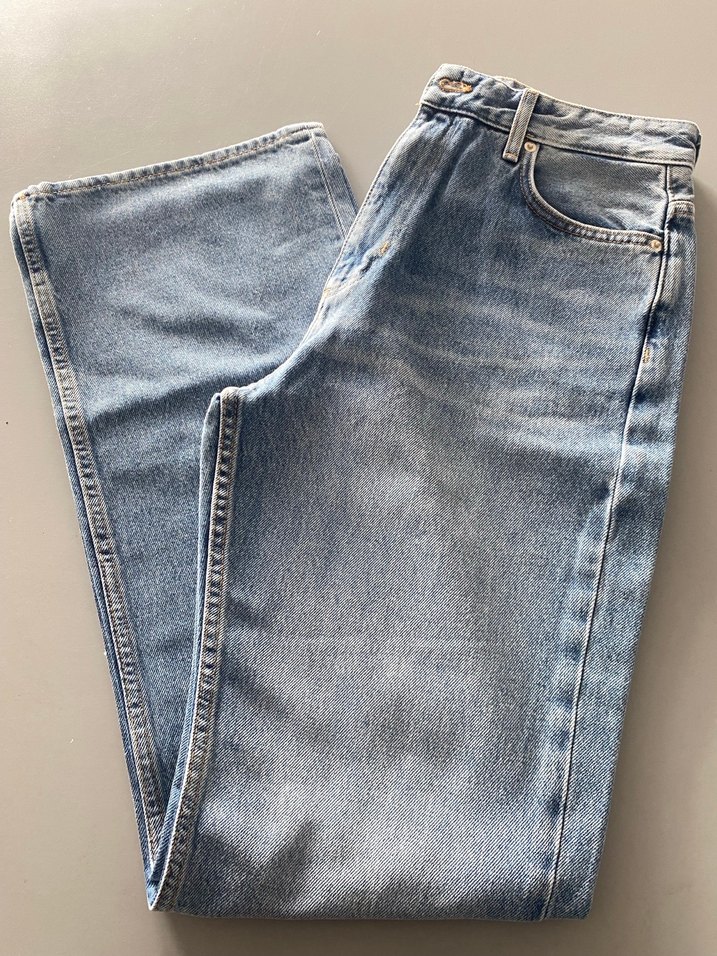 Düğmeli, mavi denim kadın kot pantolon. Regular fit ve normal boyda. Günlük ve sokak stiline uygun, desensiz tasarım.