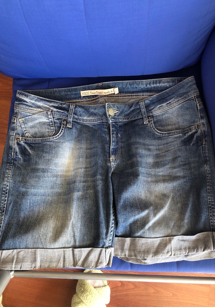 Düğmeli, bol kesim mavi kot şort, kıvrımlı paçalar ve günlük rahat kullanım için uygundur.