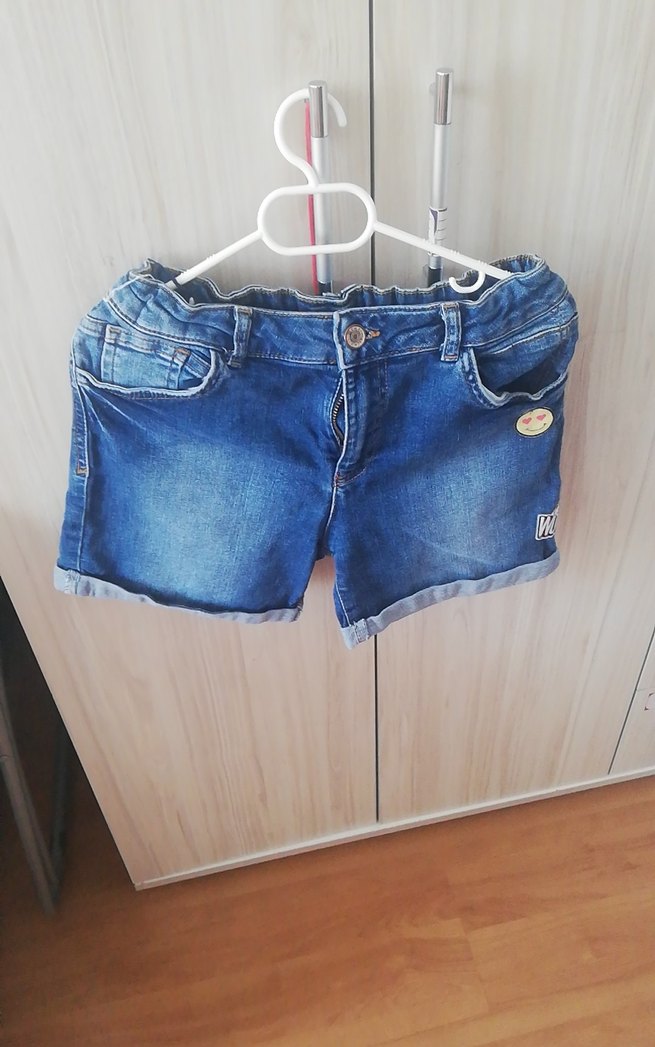 Düğmeli, parlak mavi renkte, bol kesim kısa kadın kot şort. Günlük sokak stili için uygundur, desensiz ve mini boydadır. kızımın çok az giydi