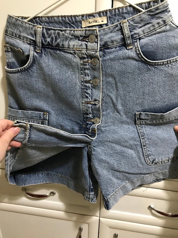 Düğmeli ön kısmı ve bol kesimiyle mavi kot şort etek. Dayanıklı denim kumaşından, kısa mini boyda ve günlük sokak stili için uygun.