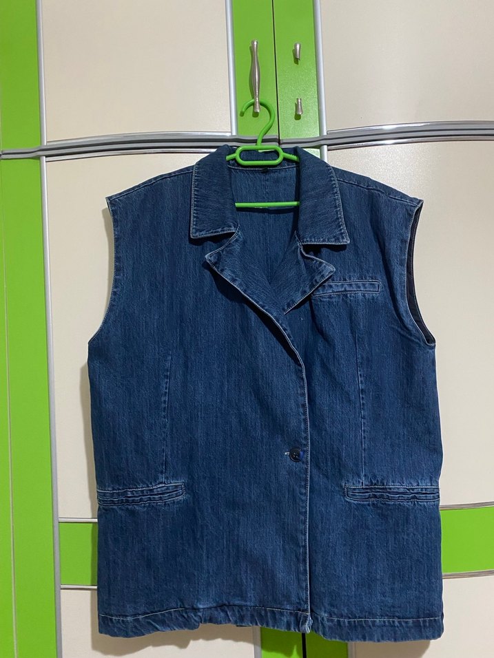 Düğmeli, mavi kot kumaştan, kolsuz ve normal kesim yelek. Notlu yaka ve gündelik kullanıma uygun tarz sunar. L bedendir XL de uyumludur hiç giyilmemiştir.