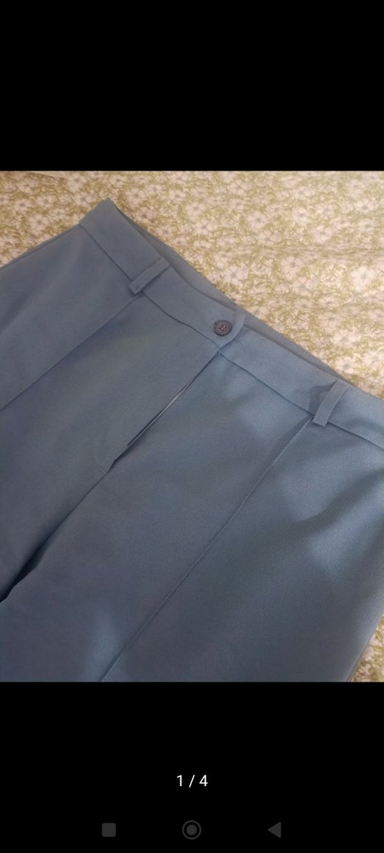 Düğmeli, mavi kadın kumaş pantolon, normal boy ve düz kesim. İş ortamına uygun, basic ve şık bir tasarıma sahiptir. yüksek bel 42 beden birkaçkez giyildi.