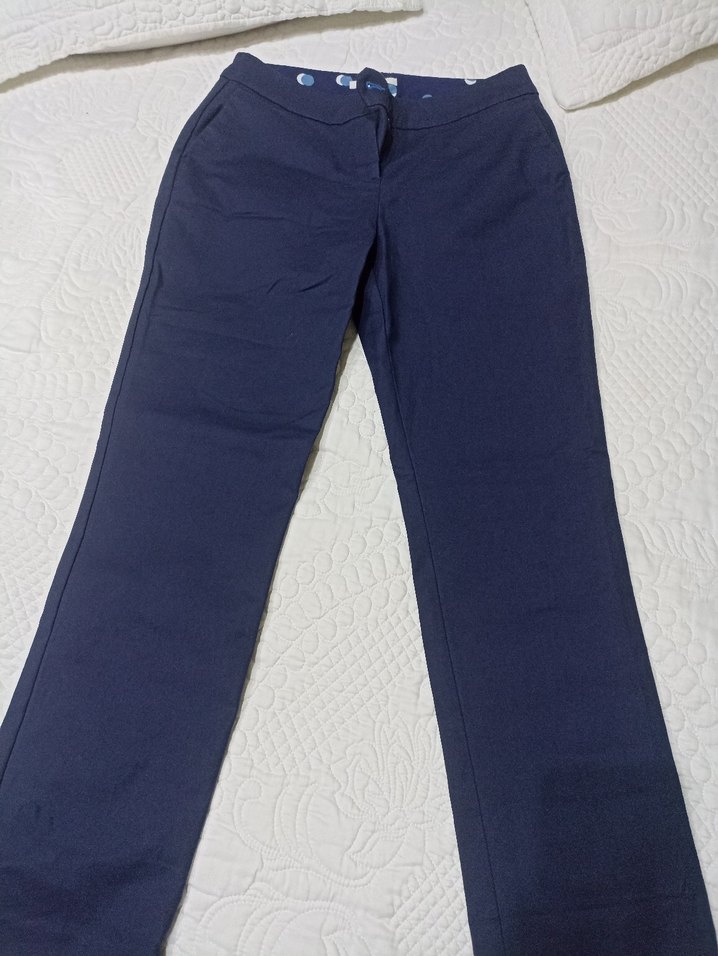 Düğmeli, normal boy midi uzunluğunda, düz mavi kadın kumaş pantolon. Sentetik kumaştan yapılmış, rahat ve gündelik kullanıma uygun.