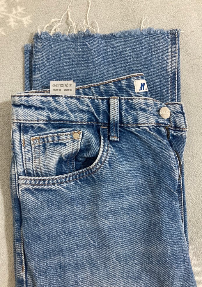 Düğmeli kapanışa sahip, baskılı desende, normal kesim ve midi boy mavi kadın denim pantolon. Günlük sokak stiline uygundur.Orijinaldir yırtık kısmında dikiş izi vardır fotoğrafta belirttimm