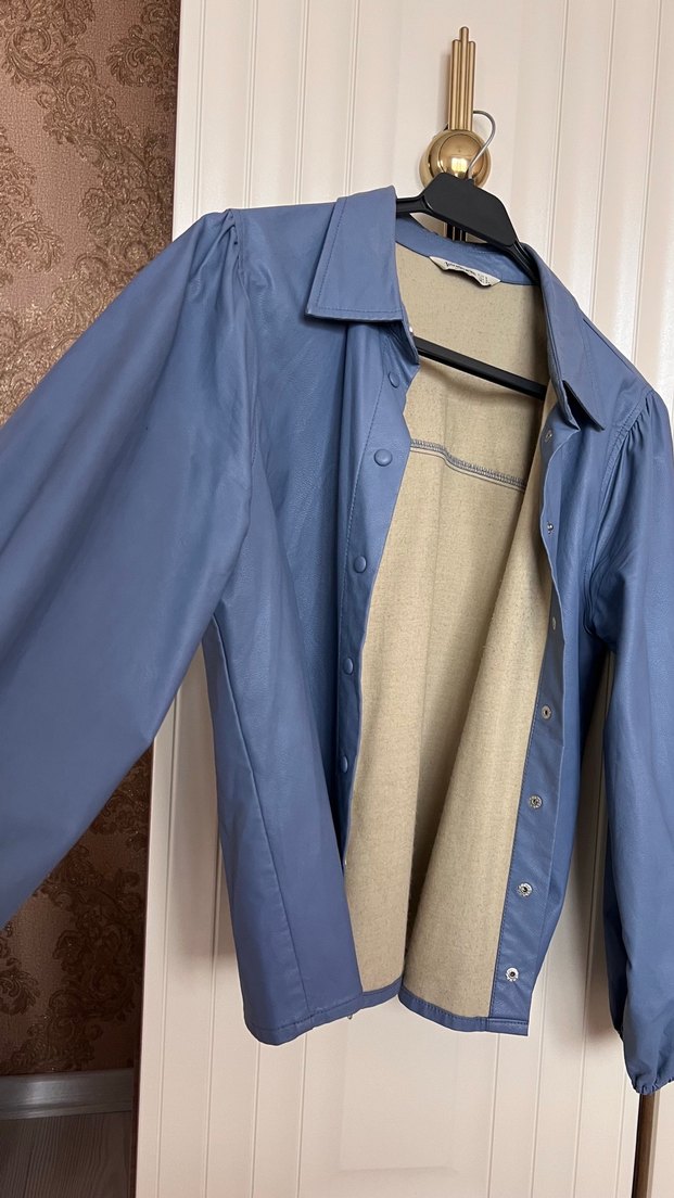 Düğmeli, mavi renkte, deri kumaştan yapılmış kadın midi ceketi. rahat kesimle günlük kullanıma uygun.