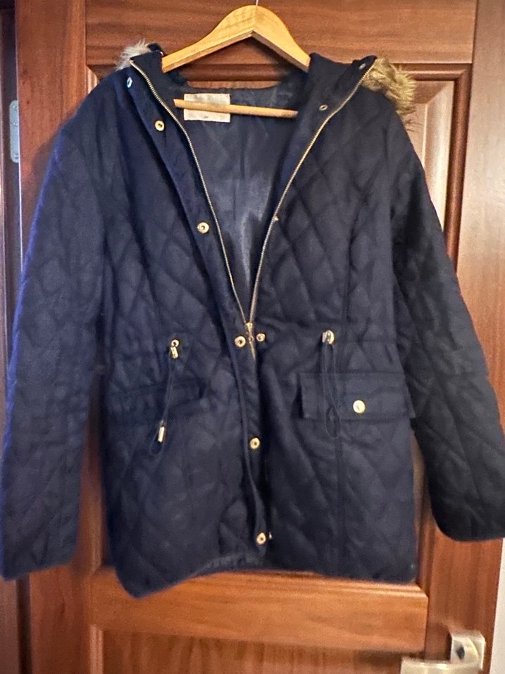 Düğmeli, mavi renkli, midi uzunlukta, notched lapel yakalı, uzun kollu ve rahat fleece kumaştan yapılmış kadın ceketi.