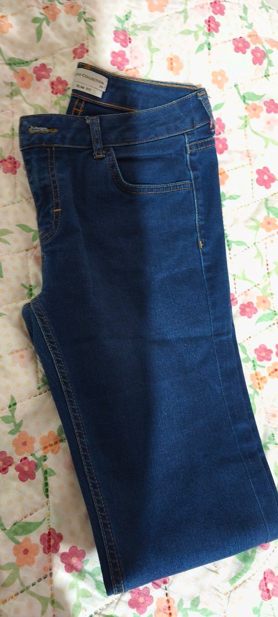 Düğmeli tasarıma sahip, normal midi boyda, oturan kesim mavi kot pantolon, günlük rahat kullanım için uygun.