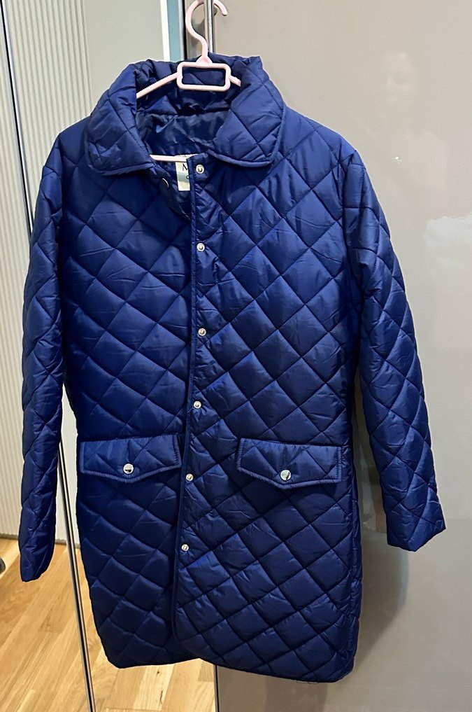 Düğmeli, mavi renkli kadın midi mont, parlak yüzeye ve kesilmiş yakaya sahiptir. Uzun kollu, normal kesim ve kapitone sentetik kumaftan yapılmıştır. Günlük sokak stili için uygundur.