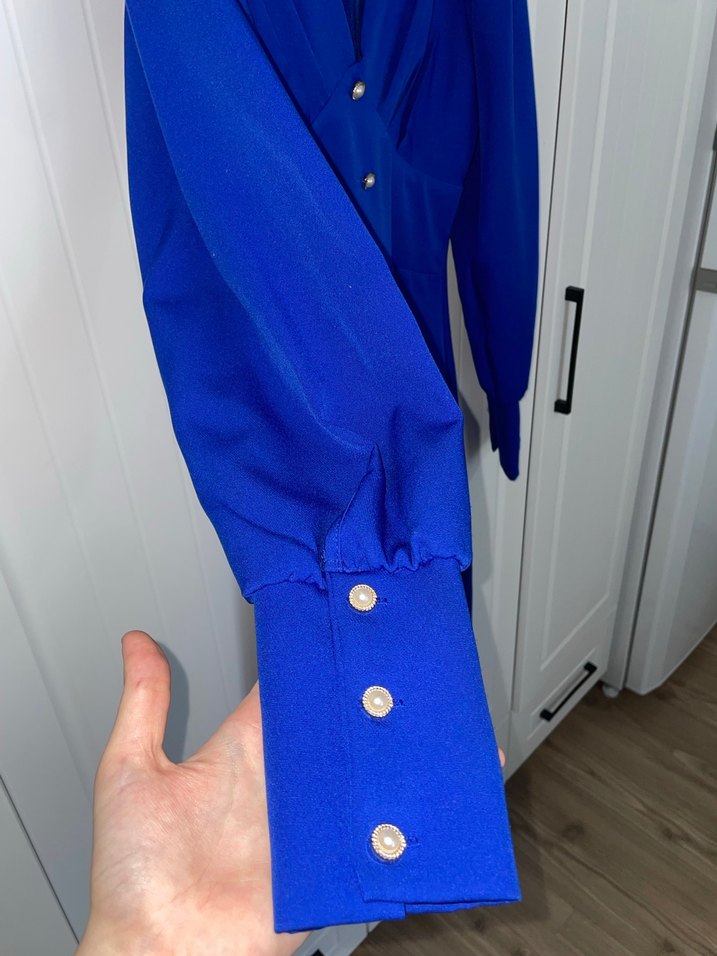 Hiç bir yırtık leke vs. Yoktur .Düğmeli manşetli uzun kollu, parlak mavi midi ofis elbisesi. Notlu yaka ve normal kesim ile şık ve rahat bir görünüm sunar.