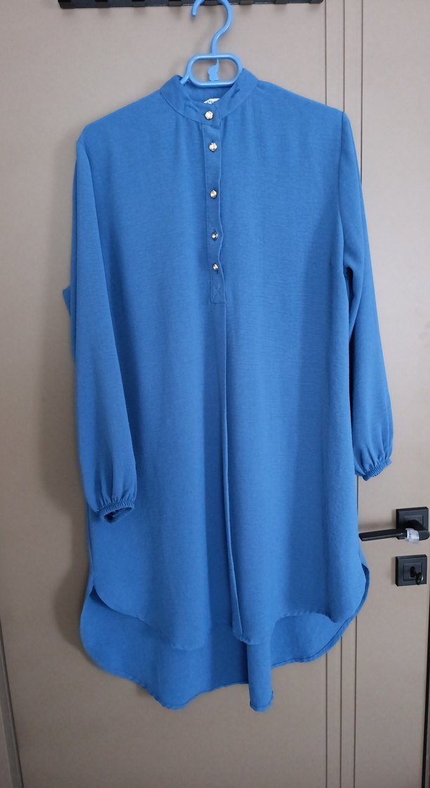 tesettür uzun tunik ,gömlek yüksek yakalı, düğmeli ve uzun kollu, bol kesim midi tunik. Rahat ve günlük kullanım için uygundur. iki koltuk altı 59 cm önden uzunluk 95 cm arkadan uzunluk 108 cm esnek likralı kaliteli ağır dökümlü tril tril kumas 1 kez kullanıldı .