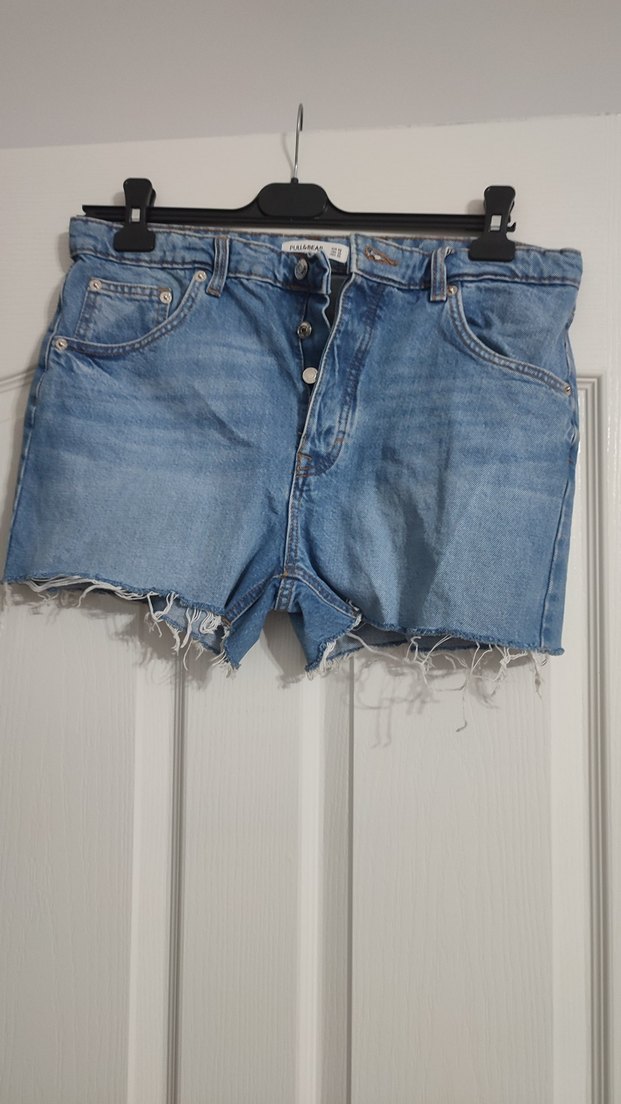 Düğmeli, bol kesim, mavi denim mini şort. Püsküllü kenarları ve desen içermeyen tasarımıyla günlük sokak stili için uygundur. En 44 boy 32
