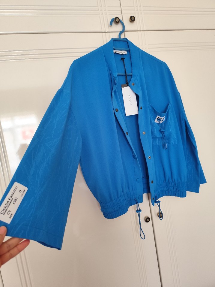 Parlak mavi renkte, düğmeli, mini uzunlukta ve uzun kollu kadın gömleği. Notlu yaka ve bol kesim, ipeksi kumaş ve baskılı desene sahip.