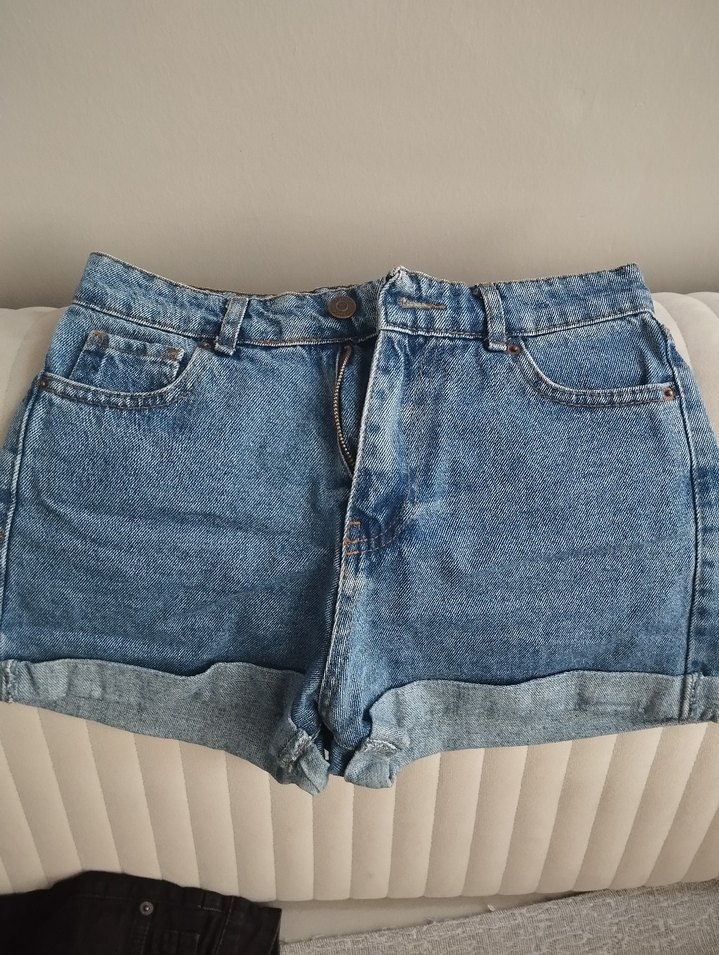 Düğmeli kapama ve kıvrılmış paçalarla rahat kesim mavi mini kot şort, günlük rahat kullanıma uygundur.