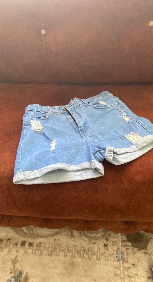 Düğmeli, yıpranmış detaylı, bol kesim mavi kot mini şort, günlük sokak stili için uygundur.