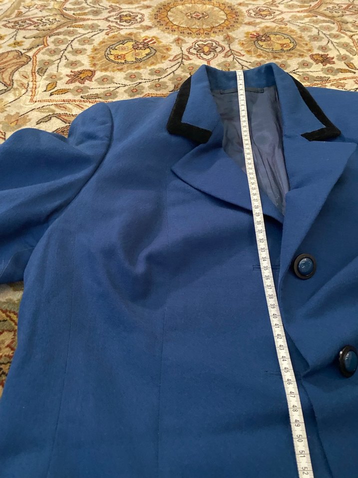 Düğmeli önü, normal boy midi uzunluğunda, notched lapel yakalı ve uzun kollu. Parlak mavi, yumuşak ve sıcak kumaştan, ofis için uygun.